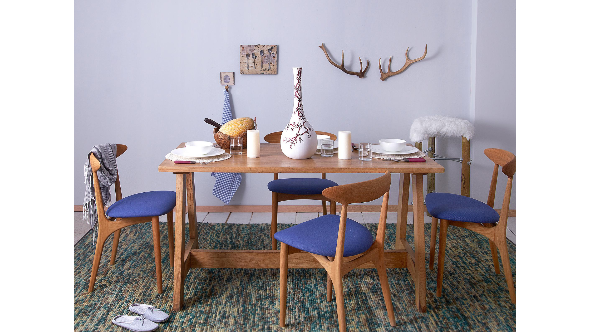 How about adding softness and warmth to Sleet walls with a little Classic Blue on your dining chair upholstery, and complementing it with an interesting mix of Ultramarine Green and Magenta Purple texture on the rug?